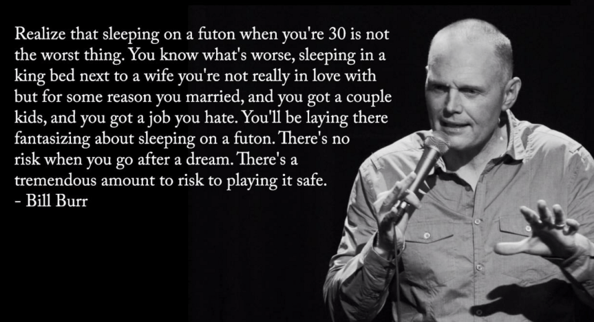 Realize that sleeping on a futon when you’re 30 is not the worst thing. You know what’s worse, sleeping in a king bed next to a wife you’re not really in love with but for some reason you married, and you got a couple kids, and a job you hate. You’ll be laying there fantasizing about sleeping on a futon. There’s no risk when you go after a dream. There’s a tremendous amount of risk to playing it safe.