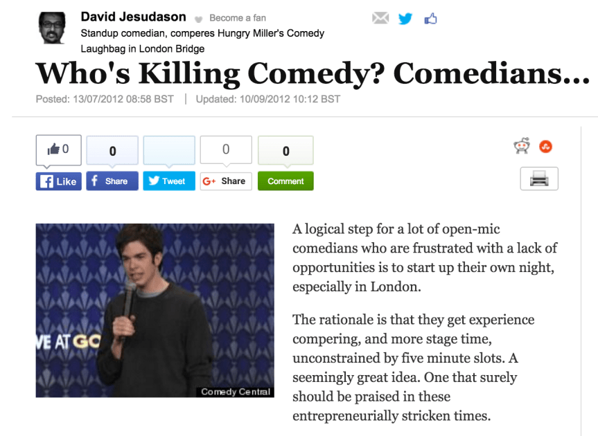 Found this brief blog post on HuffPost Comedy UK called Who’s Killing Comedy? Comedians… Now, that might be a little extreme of an argument to make, but I get what the author is saying. Often times a lot of comics starting out will do anything to work their way into the industry and often times that means sacrificing actually being funny and putting on good shows to just appear as if you are doing well. It’s really frustrating when what everyone truly wants to see is just good, funny material.
