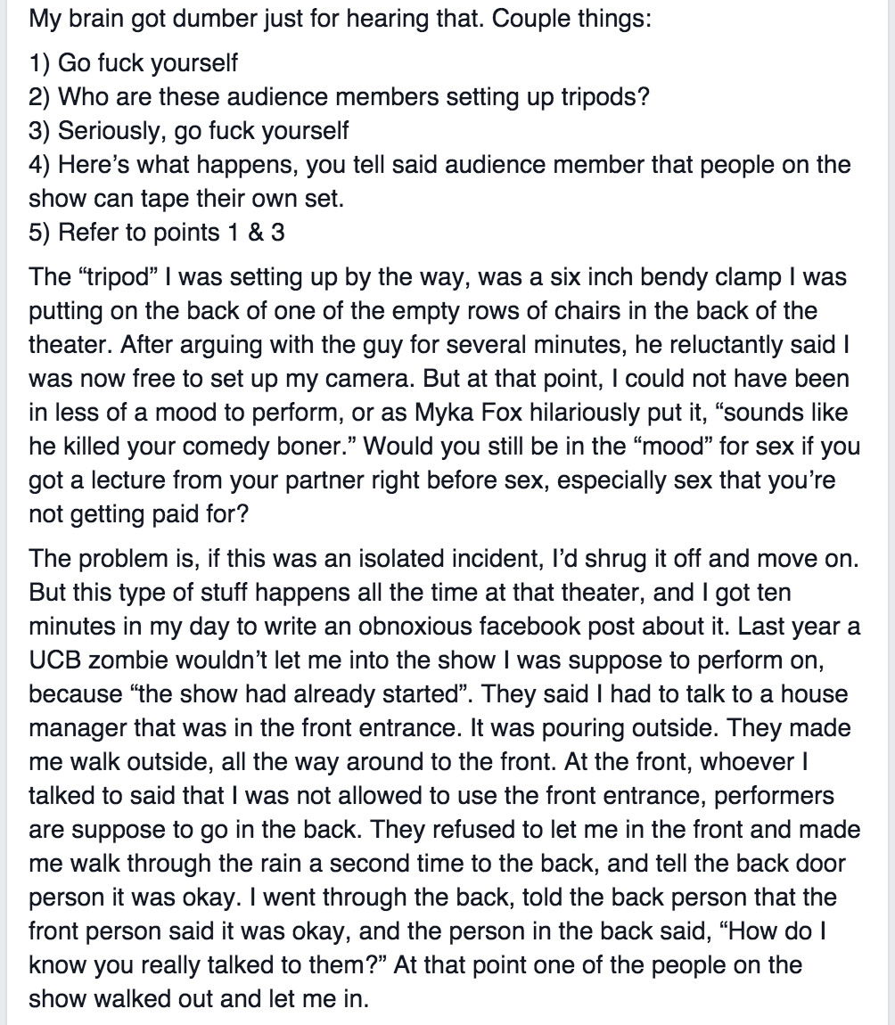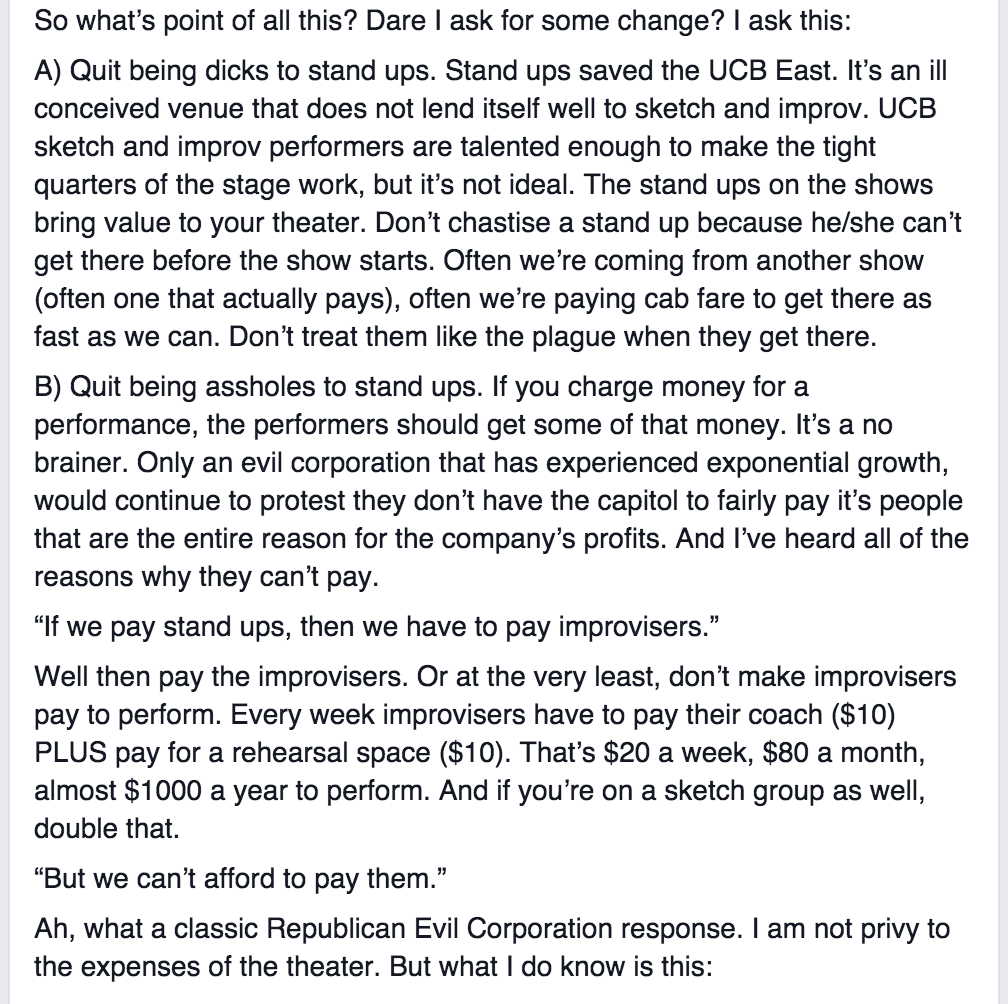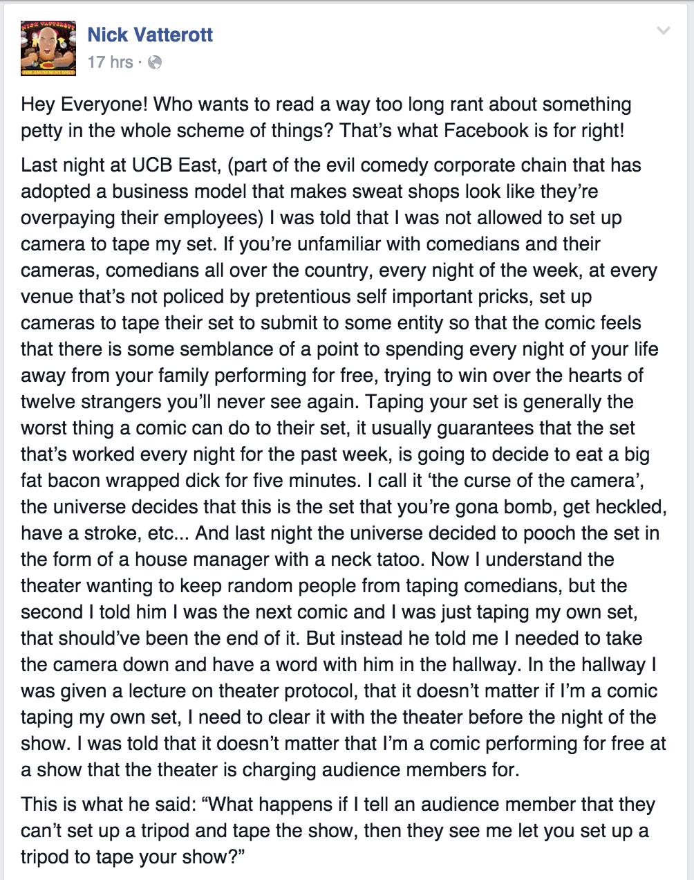 Yesterday, in frustration with the Upright Citizens Brigade Theater, he typed out this long Facebook post, which has accumulated upwards of 800 likes and 80 shares in 17 hours. His frustrations with the theater have garnered a lot of support from the stand up community. Everybody seems to be sharing or posting about it today!