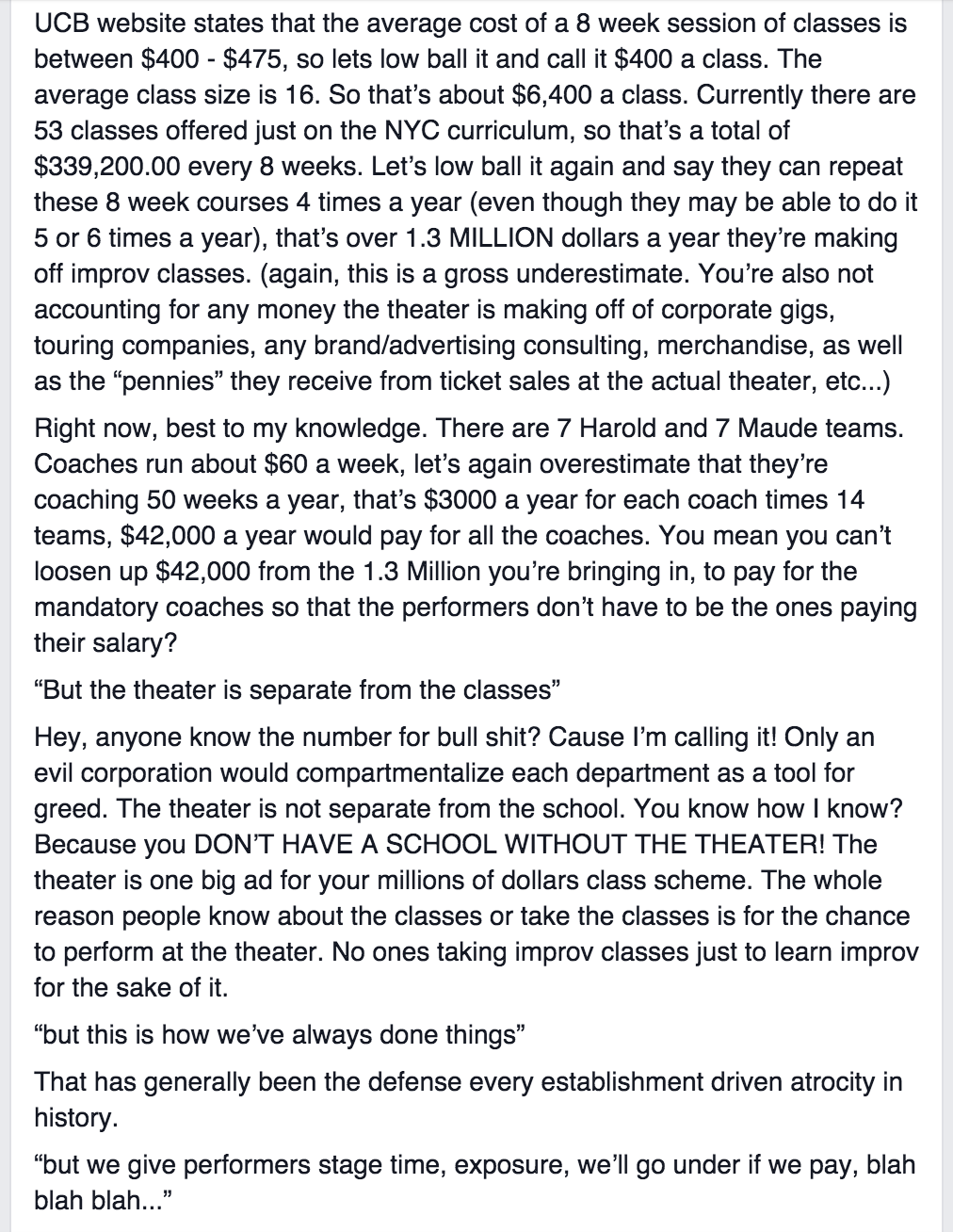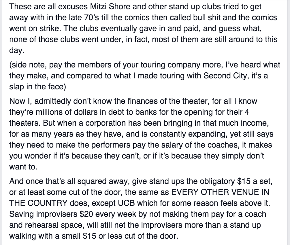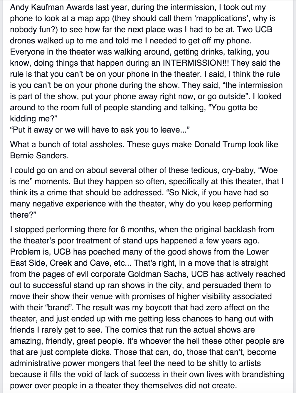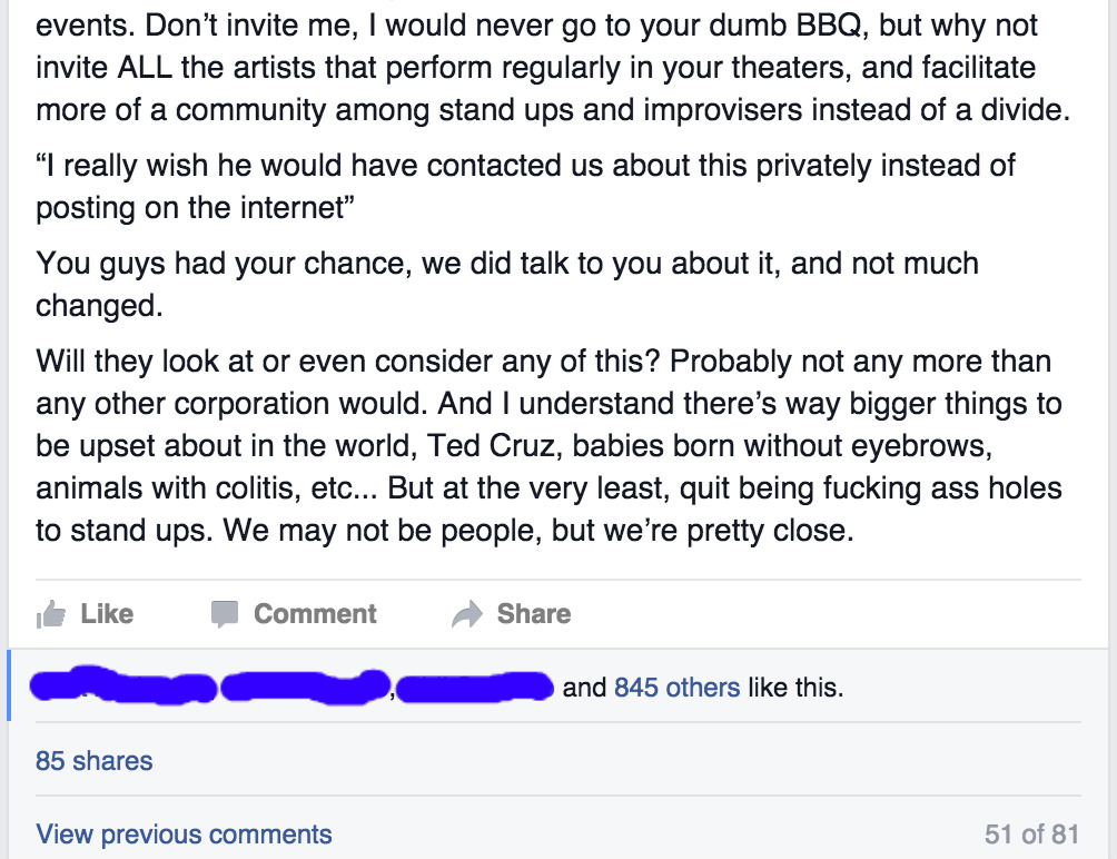 Yesterday, in frustration with the Upright Citizens Brigade Theater, he typed out this long Facebook post, which has accumulated upwards of 800 likes and 80 shares in 17 hours. His frustrations with the theater have garnered a lot of support from the stand up community. Everybody seems to be sharing or posting about it today!