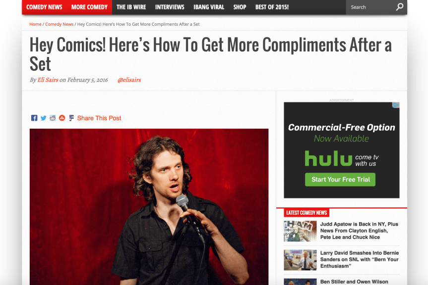 Eli Sairs is a great comedian in NYC and I see him at The Creek and the Cave all the time. He wrote this funny piece for the The Interrobang about how you can get people to compliment you after you have a monster set. I like it.